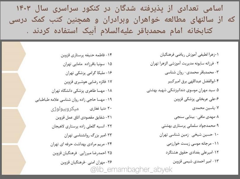 کتابخانه امام محمد باقر (ع) قدیمی ترین کتابخانه شهرستان آبیک میباشد که در سال 1356در زمینی به مساحت 1600 مترمربع احداث گردید . این کتابخانه در بافت مرکزی شهر آبیک و در مجاورت پارک شهید رجایی قرار گرفته و با توجه به برگزاری برنامه های متنوع فرهنگی و بروزرسانی منابع ، توانسته نگین فرهنگی شهر آبیک باشد.